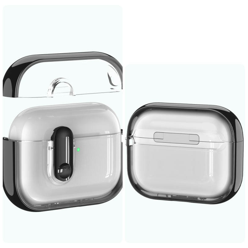 Protect your AirPods Pro 3 in style with this transparent case featuring a sophisticated design. Its electroplated frame offers a glossy finish, while the integrated carabiner makes it easy to carry. Compatible with wired and wireless charging.