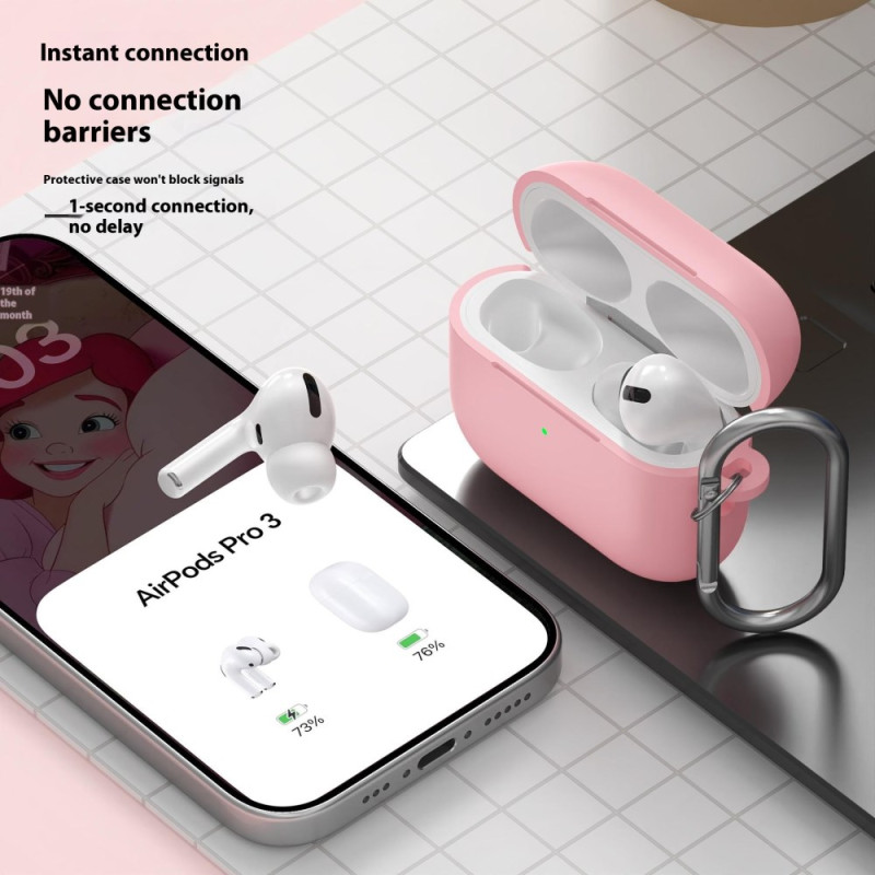 Protect your AirPods Pro 3 with this 2.3mm thick silicone case. Full protection against knocks and drops, compatible with wireless charging. Comes with a practical carabiner for secure everyday transport.