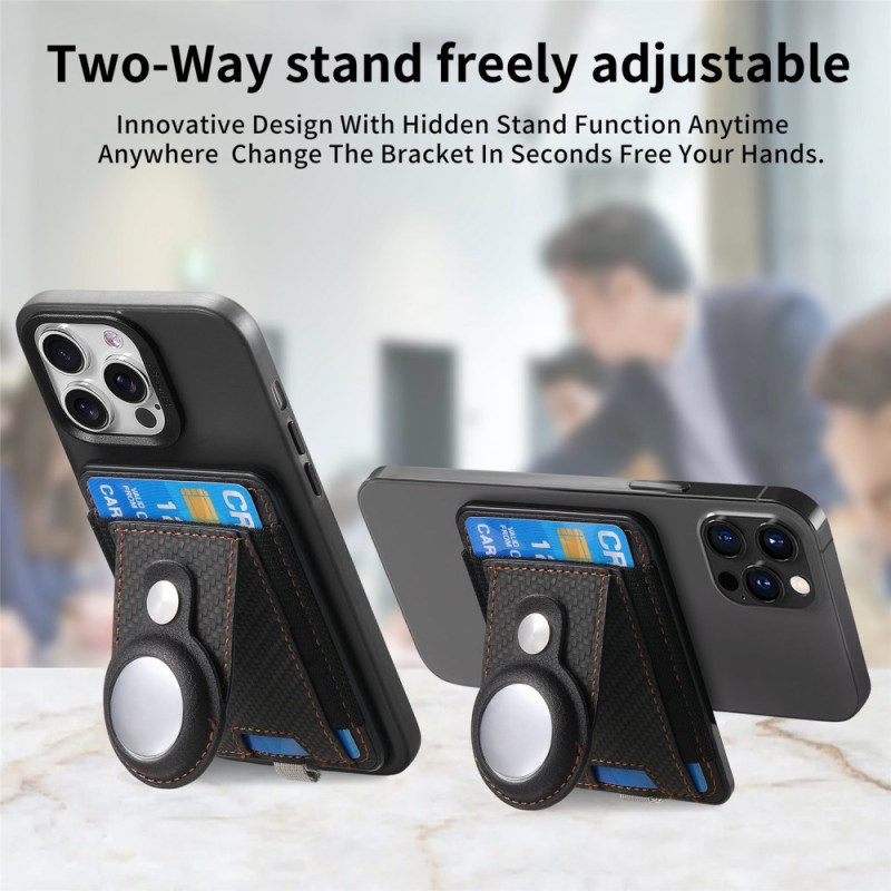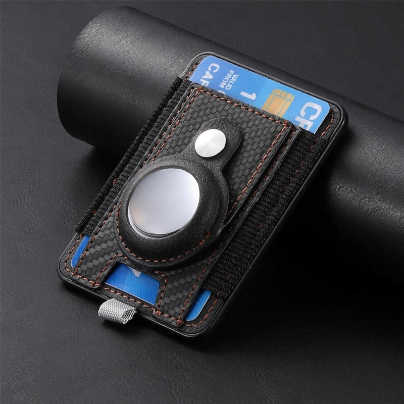 Fabriqué en cuir végétalien texturé fibre de carbone, il offre une forte attraction magnétique, un rangement pratique pour vos cartes essentielles et une intégration optimisée pour AirTag.