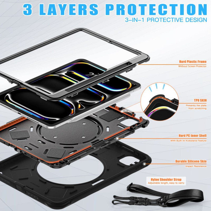 This rugged case for iPad Pro 11 (2025) / 11 (2024) offers superior protection with its hybrid design. It features a 360° rotating stand, stylus slot, shock-absorbing design and rotating handle. Ideal for work and play, it comes with an adjustable shoulder strap for easy carrying.