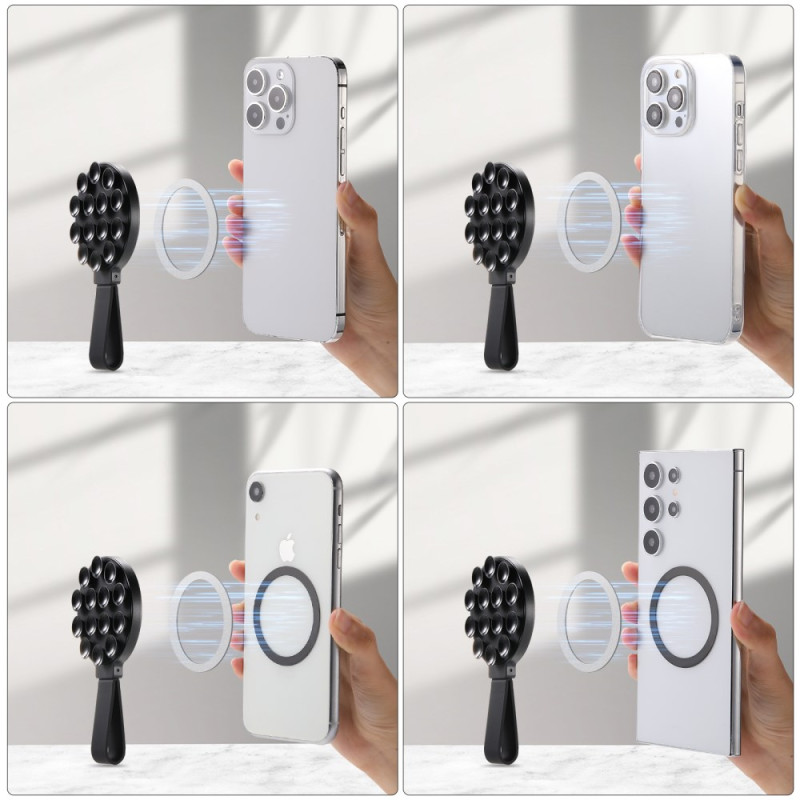 Diese magnetische Telefonhalterung mit rutschfestem Saugnapf bietet eine einfache und ultra-polyvalente Lösung, um Ihr Smartphone an jeder glatten Oberfläche zu befestigen: Spiegel, Glas, Fliesen, Computerbildschirme oder sogar Kühlschränke. Er wurde für MagSafe entwickelt und bietet eine starke, sofortige magnetische Befestigung für das iPhone 12 bis 15 oder kompatible Hüllen. Sein System aus 14 Minisaugern ahmt die Struktur eines Oktopus nach und sorgt so für eine zuverlässige Haftung. Aus hochwertigem Silikon gefertigt, schützt sie Ihr Handy und bleibt dabei flexibel, langlebig und leicht. Ideal zum Erstellen von Inhalten, zum Führen von Videogesprächen oder um Ihr iPhone in eine professionelle Webcam zu verwandeln.