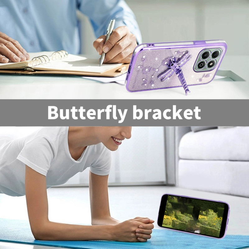 Schützen Sie Ihr Honor X6b 4G elegant mit dieser glitzernden Hülle, die mit ewigen Blumen und Strasssteinen verziert ist. Der integrierte Libellenhalter ermöglicht freihändiges Betrachten, während die erhöhten Ränder Ihre Kamera effektiv schützen.