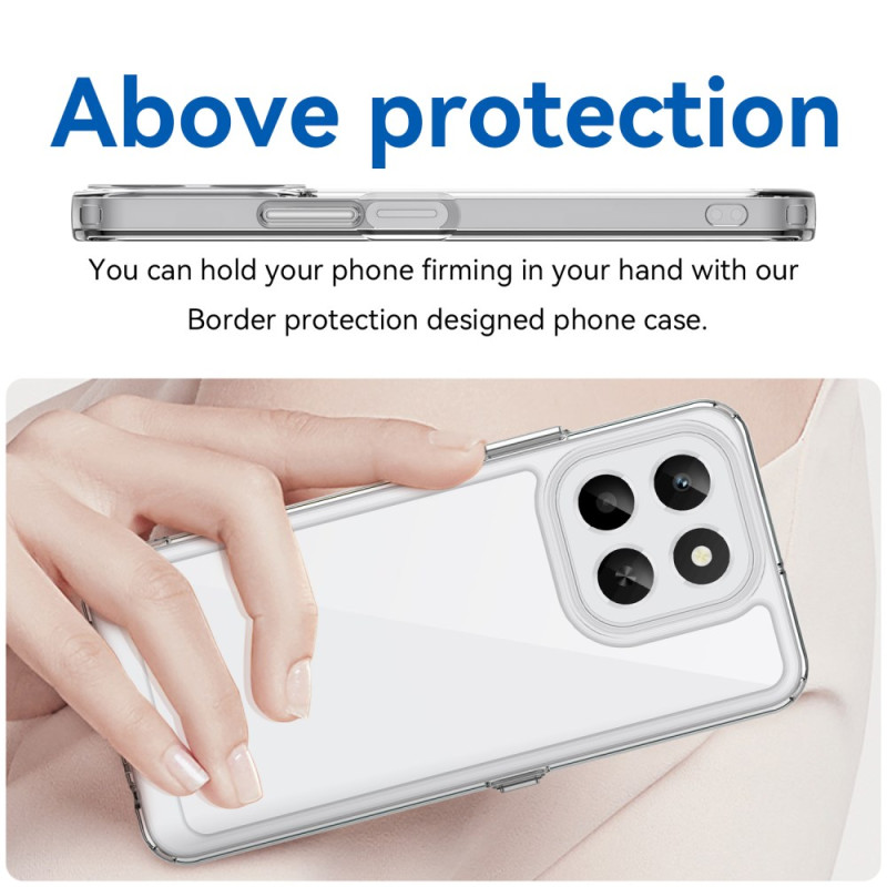 Transparenter Komplettschutz für Honor X6c 4G. Luftkissen an allen vier Ecken zur Stoßdämpfung, erhöhte Ränder zum Schutz des Bildschirms und der Kamera. Kristallklares Design, das das Originaldesign des Telefons bewahrt, inklusive Folie aus gehärtetem HD-Glas.