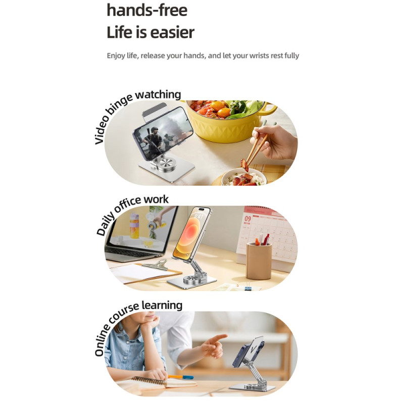 Der faltbare und drehbare Schreibtischständer L11 bietet dank seiner drei Drehachsen, die eine präzise Einstellung der Höhe und des Betrachtungswinkels ermöglichen, einen außergewöhnlichen Benutzerkomfort. Hergestellt aus einer hochwertigen Aluminiumlegierung mit einer Basis aus Karbonstahl und Silikonkufen, garantiert er Stabilität und Sicherheit für Ihre Geräte. Er ist kompakt und elegant und eignet sich für alle Smartphones bis zu einer Größe von 6,4 Zoll mit einer maximalen Dicke von 1,2 cm. Er ist ideal für Videotelefonate, Telearbeit oder das Anschauen von Inhalten und lässt sich leicht zusammenklappen und überall hin mitnehmen.