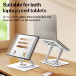 Dieser Laptop- und Tablet-Ständer vereint dank seines Designs aus Karbonstahl und seines 360°-Drehsystems Robustheit und Bedienkomfort. Er ist mit Geräten von 12 bis 17,3 Zoll kompatibel und ermöglicht die Anpassung der Höhe und des Blickwinkels für einen ergonomischen und individuell anpassbaren Arbeitsplatz. Sein durchbrochenes Design fördert die Luftzirkulation für eine optimale Kühlung, auch bei längerer Nutzung. Da er zusammenklappbar und leicht transportierbar ist, fügt er sich nahtlos in jede Büro- oder Wohnumgebung ein und sorgt so für dauerhaften Komfort im Alltag.