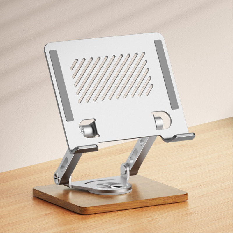 Dieser verstellbare und drehbare Ständer für Tablets und Computer bietet eine vielseitige Lösung, die Bedienkomfort und optimierte Leistung miteinander verbindet. Dank seiner reibungslosen 360°-Drehung lässt sich der Betrachtungswinkel leicht anpassen, während das integrierte Kühlsystem die Wärmeableitung Ihres Geräts verbessert. Die Konstruktion aus robustem Karbonstahl, elegantem Holz und rutschfestem Silikon sorgt für Stabilität und Langlebigkeit. Dank seiner faltbaren Struktur lässt er sich leicht aufbewahren und transportieren und ist ideal für den Gebrauch zu Hause oder unterwegs. Sie ist mit Geräten bis zu 12,9 Zoll kompatibel und bietet Ergonomie und Zuverlässigkeit für den Alltag.