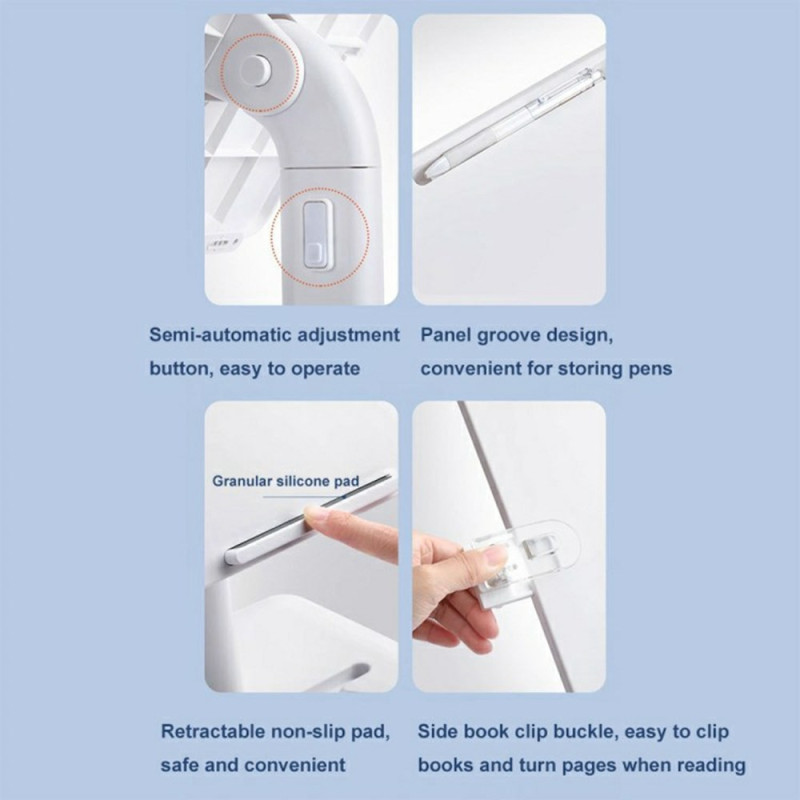 Dieser Leseständer für Kinder bietet eine ideale ergonomische Lösung, um eine korrekte Haltung beim Lernen oder Lesen zu fördern. Dank seines verdickten Rahmens bietet er eine hervorragende Stabilität, ohne zu wackeln. Mit seinem halbautomatischen Verstellsystem lässt sich der Winkel schnell und mühelos anpassen, während die teleskopische Höhe für Kinder unterschiedlichen Alters geeignet ist. Die neigbare Platte kann in eine ebene Fläche verwandelt und als kleiner Schreibtisch genutzt werden. Sie ist leicht und einfach zusammenzubauen und verfügt über eine Stifthalterungsnut und rutschfeste Seitenclips, um Bücher und Materialien sicher an Ort und Stelle zu halten.