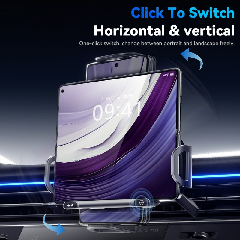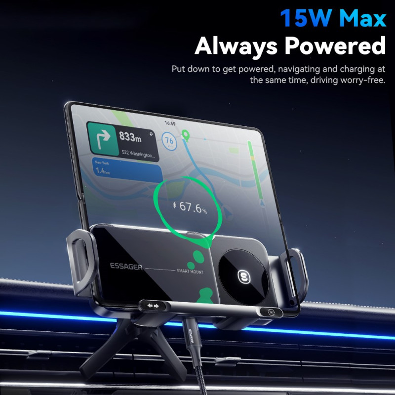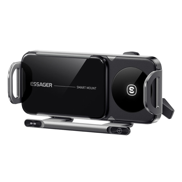 Entdecken Sie den ESSAGER Telefonhalter mit 15W kabellosem Ladegerät. Stabiles dreieckiges Design, einfache Drehung, integrierter 150mAh-Akku für 500 Zyklen. Adlerkrallen-Klemme für eine solide Befestigung am Lüftungsgitter.