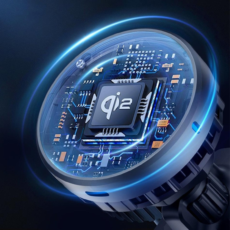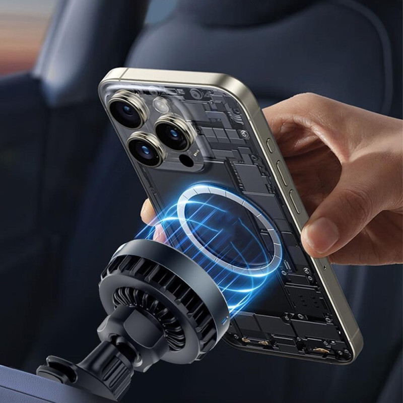 Innovative 2-in-1-Halterung, die ein magnetisches kabelloses 15-W-Ladegerät und einen Telefonhalter für Lüftungsgitter kombiniert. Ausgestattet mit einem fortschrittlichen Kühlsystem mit Turbolüfter und Kühlkörper, hält es Ihr Telefon während des Schnellladevorgangs kühl. Einfache Installation mit einer Hand für sichere GPS-Navigation und Anrufe.