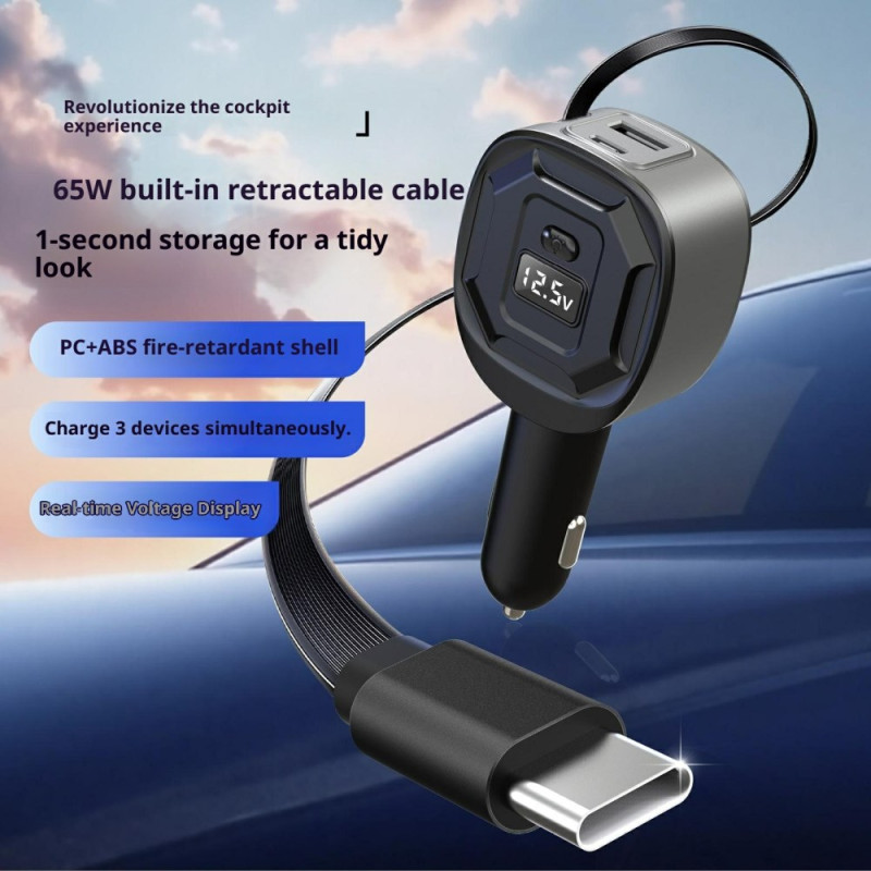Hochleistungs-Autoladegerät mit doppeltem Schnellladeanschluss (65W PD + 18W USB-A) und 78 cm langem, einziehbarem Kabel. LED-Anzeige der Batteriespannung in Echtzeit für sicheres Laden. Kompatibel mit allen 12V-24V-Fahrzeugen.