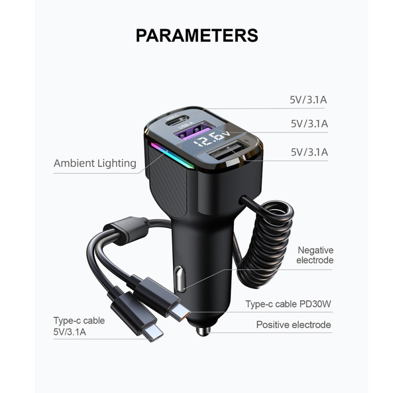 Hochleistungs-Autoladegerät mit 30W PD-Schnellladung und 1,2 m langem Type-C-Spiralkabel. Farbiges LED-Licht für einfaches Auffinden im Dunkeln. Kompatibel mit all Ihren Geräten: iPhone, Samsung, Xiaomi, Huawei und Tablets.