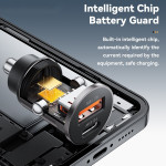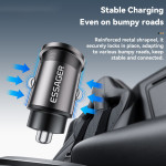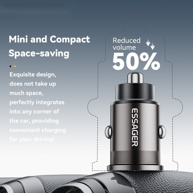 ESSAGER 45W Autoladegerät mit PD- und QC-Schnellladetechnologie. Doppelter USB-A- und Typ-C-Anschluss zum gleichzeitigen Aufladen von zwei Geräten. Ultrakompaktes Design (10g) mit intelligentem Chip für optimales und sicheres Laden. Kompatibel mit allen 12-24-V-Fahrzeugen.