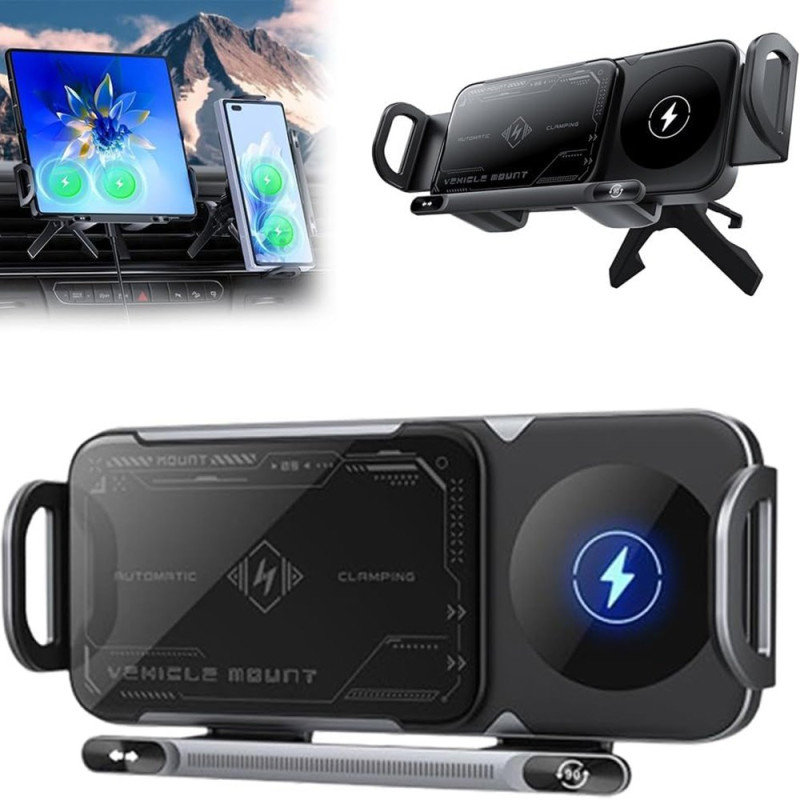 Diese Autotelefonhalterung mit kabellosem 15W-Ladegerät kombiniert Komfort, Leistung und Sicherheit für Ihre täglichen Fahrten. Dank der Schnellladefunktion ist Ihr Gerät ohne lästige Kabel wieder voll einsatzfähig. Dank seines Auto-Drehsystems lässt sich das Handy ganz einfach auf Hoch- oder Querformat einstellen, um optimal zu navigieren. Die Befestigung am Lüftungsgitter sorgt für einen sicheren Stand auch auf unebenen Straßen. Die Halterung wurde für eine Vielzahl von Telefonen und Tablets entwickelt, bietet festen Halt und ein ideales Freisprech-Erlebnis für entspanntes Fahren.