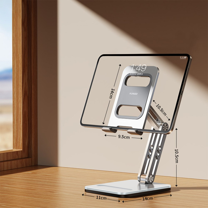 Der verstellbare XUNDD-Schreibtischständer bietet dank seiner Konstruktion aus Aluminiumlegierung, Karbonstahl und rutschfesten Silikonpolstern eine außergewöhnliche Stabilität. Sein hochfestes Drei-Achsen-System ermöglicht eine reibungslose und präzise Anpassung und trägt gleichzeitig bis zu 40 kg - ideal für schwere Bildschirme und Geräte. Die extra breite Basis sorgt für einen perfekten Halt, ohne dass die Gefahr des Umkippens besteht. Sie wurde für eine optimale Belüftung entworfen und unterstützt die Wärmeableitung bei längerem Gebrauch. Er ist zusammenklappbar und tragbar und eignet sich für alle Zwecke: Gaming, Arbeit, Videotelefonie, Zeichnen, Lernen und vieles mehr.