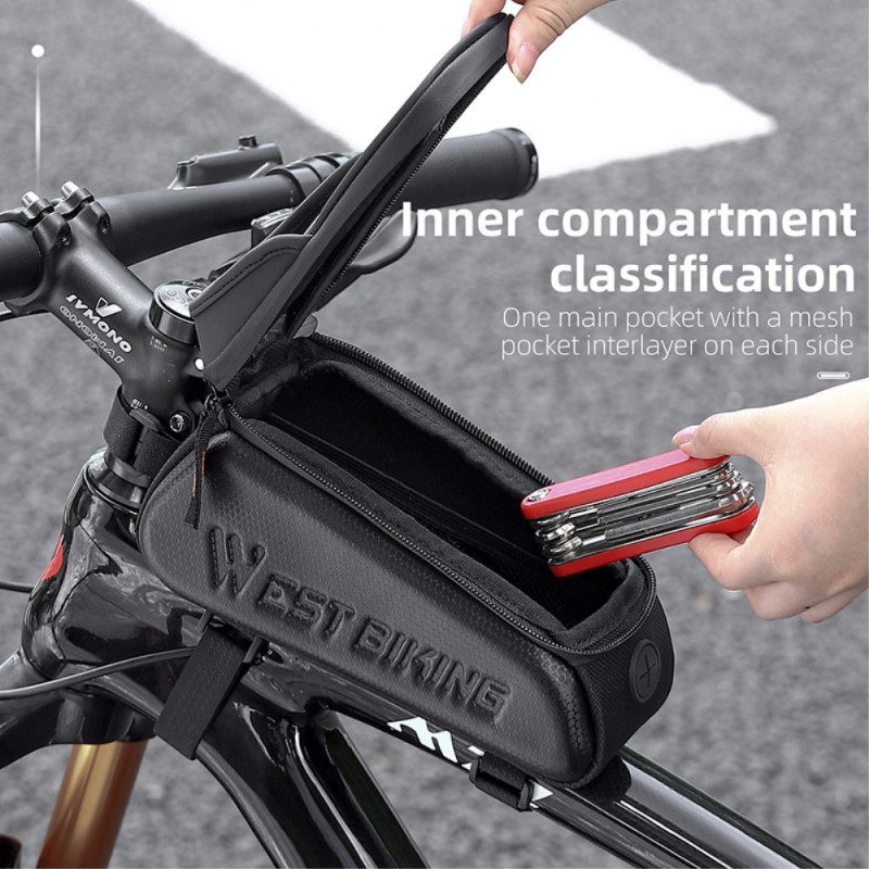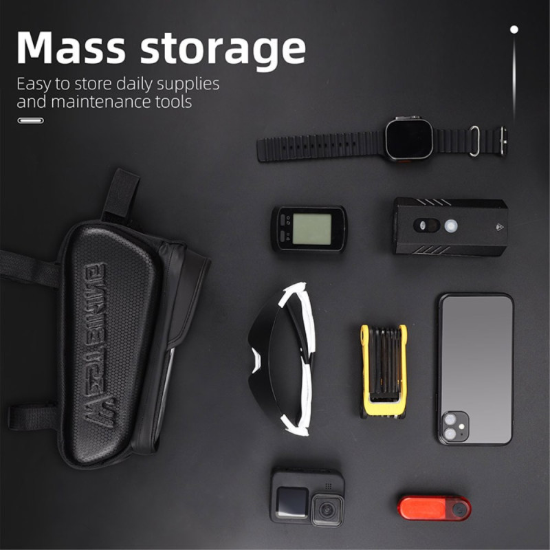 Eine reibungslose Navigation und den sofortigen Zugriff auf Werkzeuge zu entwerfen, ist das Hauptziel dieser schnell lösbaren Tasche. Hergestellt aus einer Mischung aus EVA, Leder und Polyester, bietet diese Einheit wasserabweisenden Schutz und ist verschleißfest. Ihre TPU-Touchfolie ermöglicht die Verwendung des Telefons (bis zu 6,8 Zoll) für GPS, und die integrierte Sonnenblende erhöht die Klarheit bei hellem Licht. Die Tasche verfügt über ein Fassungsvermögen von 0,8L, das für einen externen Akku und ein Reparaturset ausreicht. Das Schnellbefestigungssystem am Oberrohr sorgt für sofortiges Anbringen und Abnehmen.