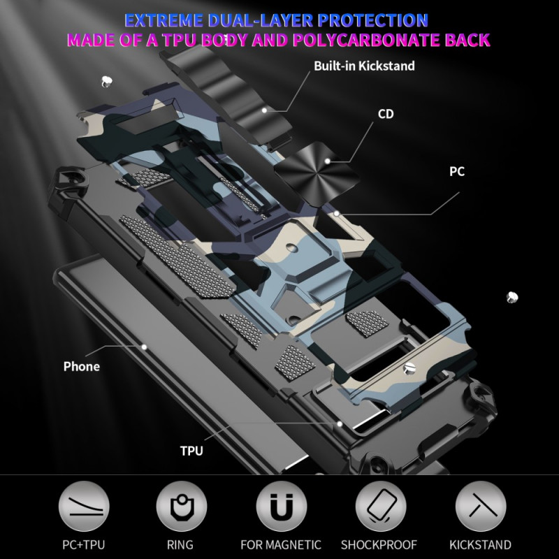 Eine ultra-robuste Hybrid-Camouflage-Hülle, die mit einem abnehmbaren Ständer kommt, um Ihr Google Pixel 6 Pro zu sichern.
