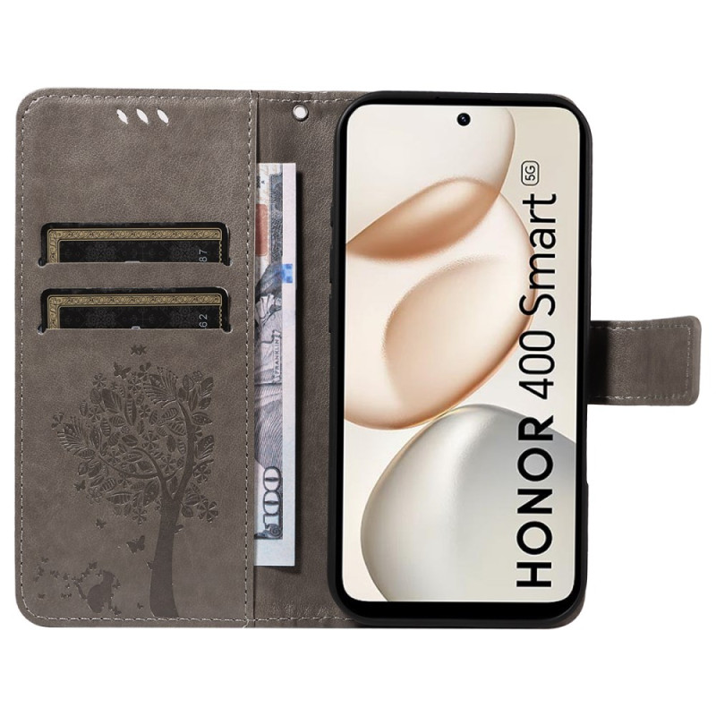 Entdecken Sie unsere elegante Brieftasche für Honor 400 Smart 4G. Hergestellt aus hochwertigem PU-Leder und mit einem aufgedruckten Katzen- und Baummotiv versehen, bietet sie robusten Schutz und einen einzigartigen Stil. Mit praktischen Funktionen wie dem integrierten Ständer, Kartenschlitzen und einer Handschlaufe bietet diese Hülle eine perfekte Kombination aus Funktionalität und Ästhetik.