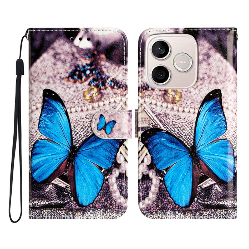 Elegantes blaues Schmetterlingsmotiv, Kartenslots, integrierter Ständer und Handschlaufe inklusive.