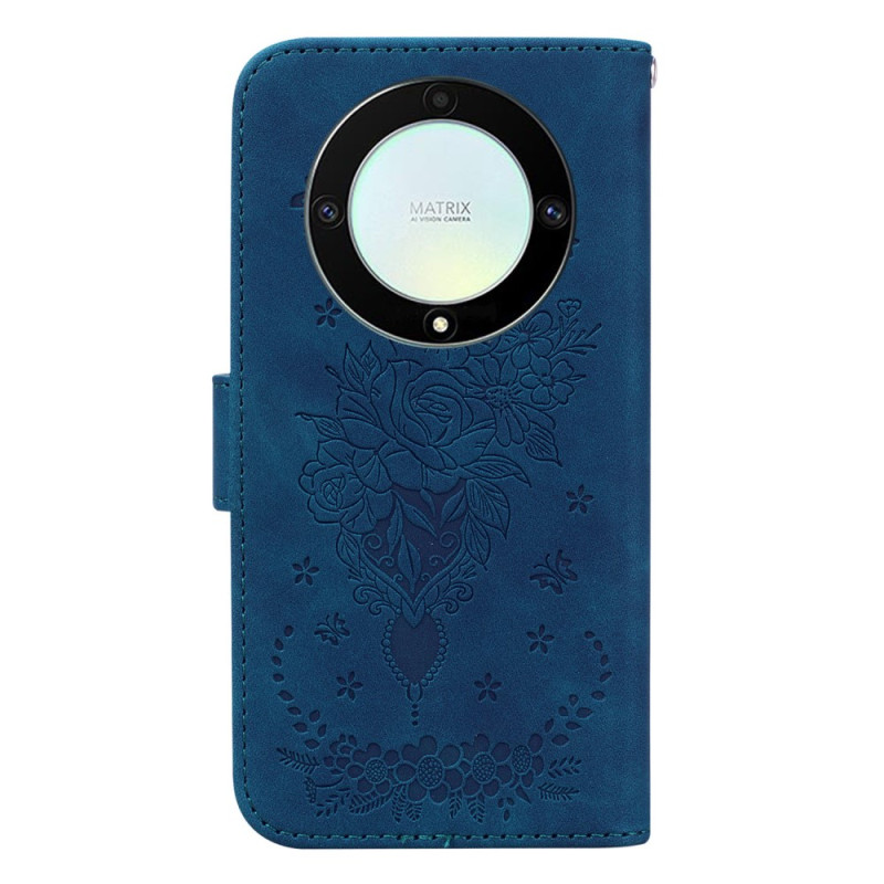 Ihr Honor Magic 5 Lite 5G / X9a ist wunderschön mit dieser mit Rosen und Schmetterlingen verzierten Hülle, die mit einem Riemen kommt.