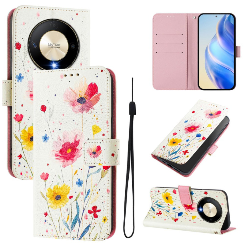 Schützen Sie Ihr Honor Magic 6 Lite / X9b stilvoll mit dieser eleganten Brieftasche mit Blumenmuster. Mit einem verstellbaren Halter mit mehreren Ecken, drei Kartenfächern und einer sicheren Handschlaufe vereint es Funktionalität und Ästhetik.