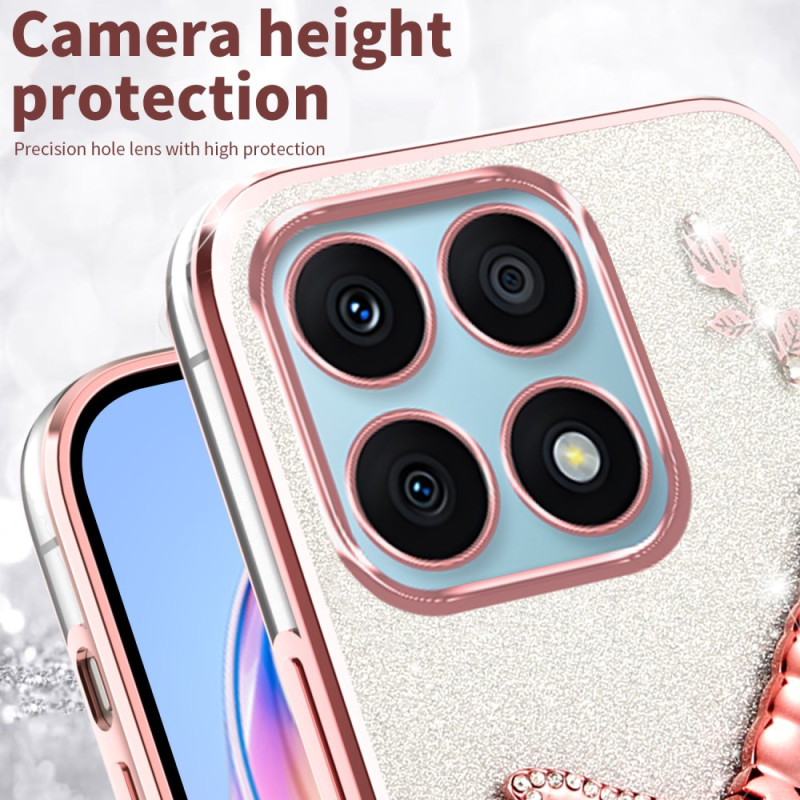Schützen Sie Ihr Honor X6a 4G elegant mit dieser glitzernden Hülle, die mit Blumen und Strasssteinen verziert ist. Der integrierte Libellenhalter ermöglicht freihändiges Betrachten, während das langlebige TPU-Design für optimalen Schutz im Alltag sorgt.