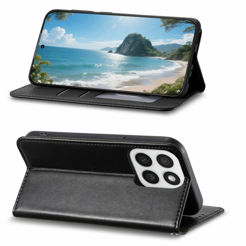 Étui portefeuille élégant pour Honor X7d 5G. Doté de coutures tricolores raffinées, 2 emplacements pour cartes, 1 poche pour billets et une dragonne pratique. Fermeture magnétique sécurisée et fonction support mains libres incluse.