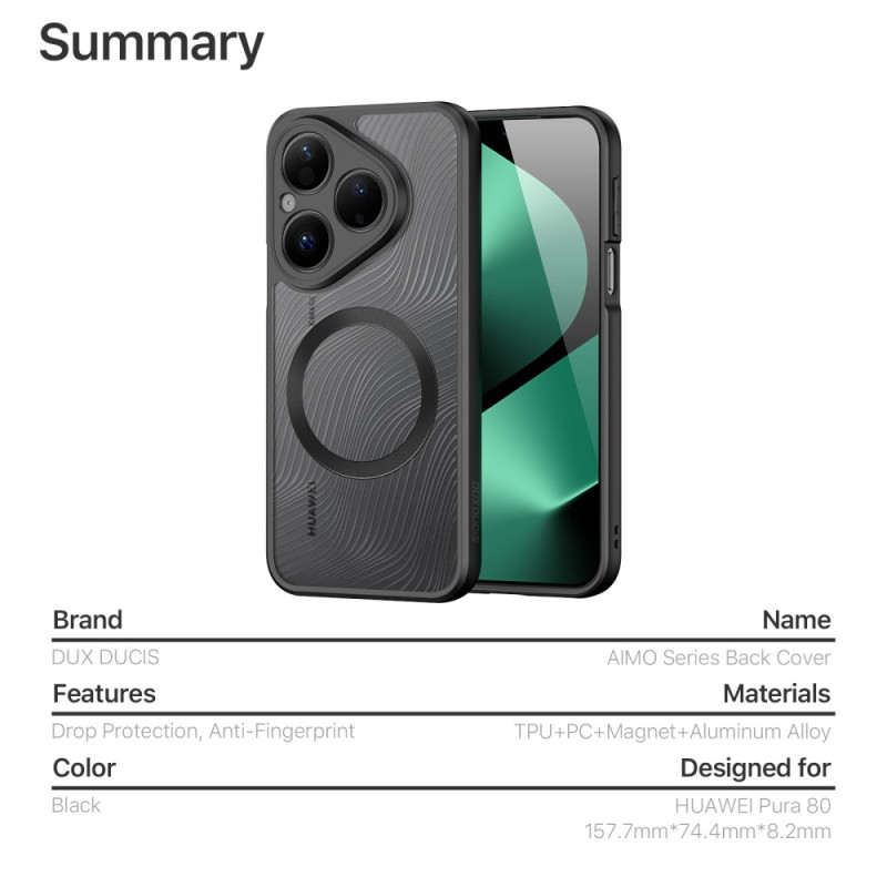 Schützen Sie Ihr Huawei Pura 80 elegant mit dieser REACH-zertifizierten Hülle von DUX DUCIS. Die ultradünne und leichte Hülle bietet einen stoßfesten Schutz, der bis zu einer Höhe von 1,2 m getestet wurde, und ist gleichzeitig MagSafe-kompatibel für optimales kabelloses Aufladen.