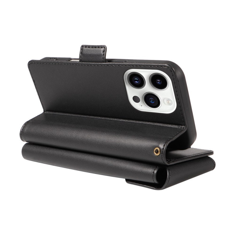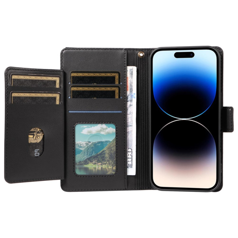 Multifunktionale Brieftasche aus PU-Leder für das iPhone 14 Pro Max. Ausgestattet mit mehreren Kartenfächern, Geldscheinfächern, integrierter Standfunktion und abnehmbarer Handschlaufe. Sicherer Magnetverschluss und präzise Schnitte für einen leichten Zugriff.