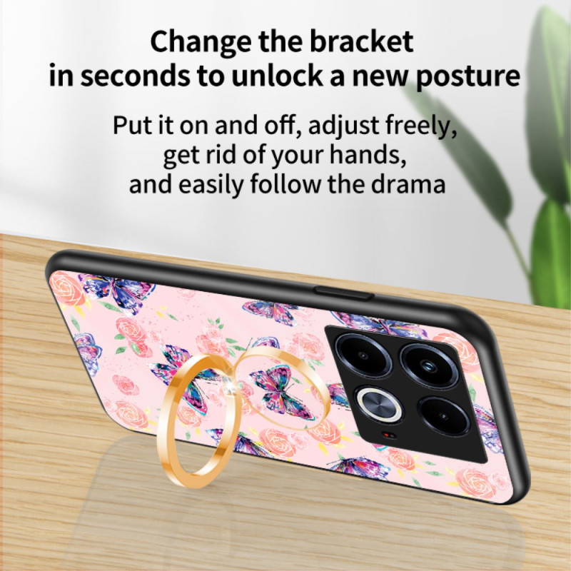 Schützen Sie Ihr Infinix Note 40 stilvoll mit dieser robusten Hülle aus gehärtetem Glas. Das mehrschichtige Design kombiniert Hartplastik, einen weichen TPU-Rand und eine Glasrückseite für optimalen Schutz vor Stößen. Der faltbare Metall-Stützring sorgt für ein komfortables Betrachten.