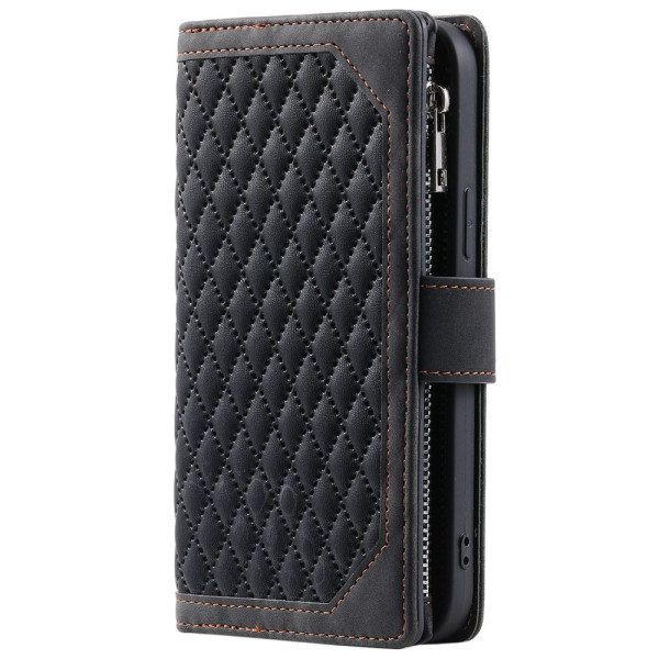 Elegante Brieftasche mit Rautenstruktur für das iPhone 13 Mini. Ausgestattet mit mehreren Kartenschlitzen, einem Reißverschlussfach und einer Freisprecheinrichtung. Sicherer Magnetverschluss und eine mitgelieferte Handschlaufe sorgen für einfachen Transport und umfassenden Schutz.