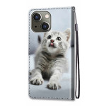 Schützen Sie Ihr iPhone 13 Mini stilvoll mit dieser Brieftasche mit elegantem grauen Katzenmotiv. Ausgestattet mit einem praktischen Klappständer, mehreren Kartenfächern und einer bequemen Handschlaufe.