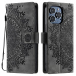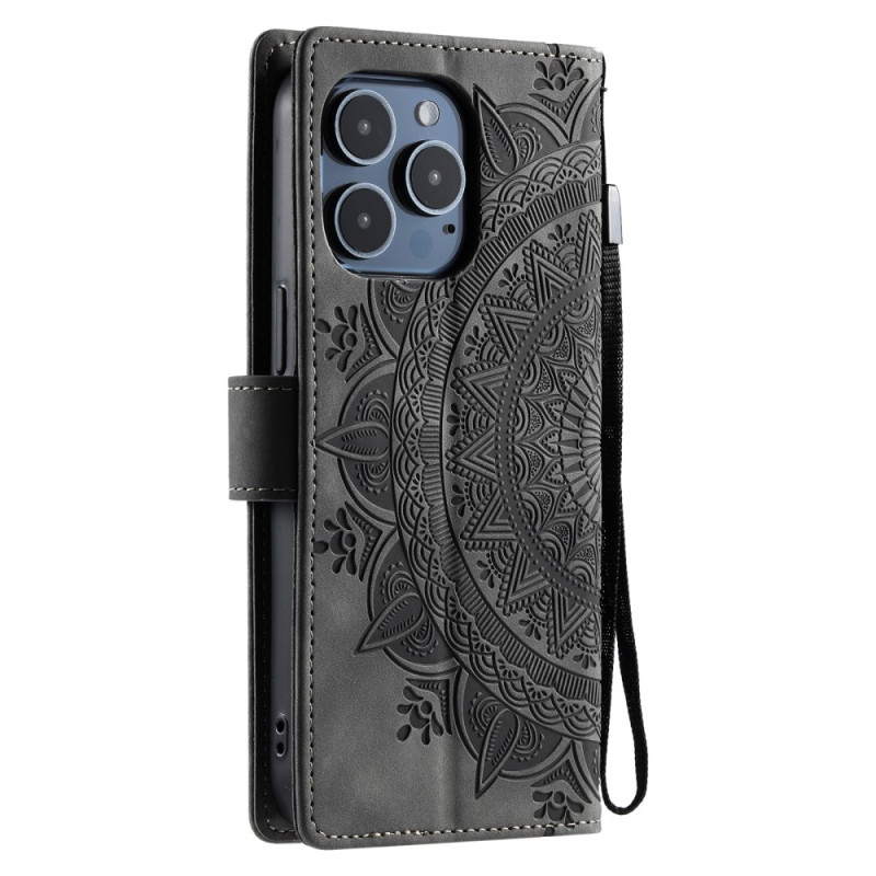 Elegante Brieftasche aus PU-Leder mit aufgedrucktem Mandala-Motiv für das iPhone 13 Pro Max. Enthält 3 Kartenfächer, ein Bargeldfach, einen Magnetverschluss und eine praktische Handschlaufe. Umfassender Schutz und integrierte Ständerfunktion.