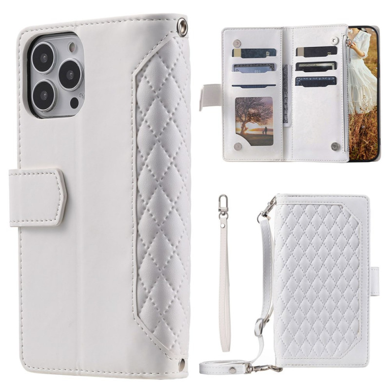 Entdecken Sie diese elegante Brieftasche für das iPhone 13 Pro Max. Es besteht aus rautenförmigem, strukturiertem PU-Leder mit einer flexiblen TPU-Hülle und bietet einen umfassenden Schutz vor Stößen. Ausgestattet mit mehreren Kartenfächern, einem Reißverschlussfach und einem ausklappbaren Ständer für freihändiges Betrachten.