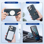 Multifunktionale Schutzhülle für das iPhone 13 Pro, die Schutz, Zweckmäßigkeit und Eleganz vereint. MagSafe-kompatibel mit abnehmbarem magnetischem Kartenhalter und integrierter verstellbarer Halterung. Perfekt für die Aufbewahrung Ihrer Karten und zum freihändigen Betrachten.