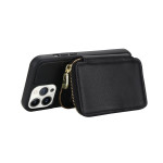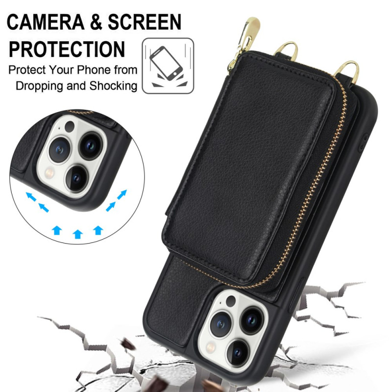 2-in-1-Brieftasche für das iPhone 13 Pro, die Stil und Sicherheit vereint. Integrierter RFID-Schutz, Reißverschluss für Karten und Bargeld, Video-Unterstützungsfunktion und abnehmbarer Schultergurt für freihändige Nutzung im Alltag.