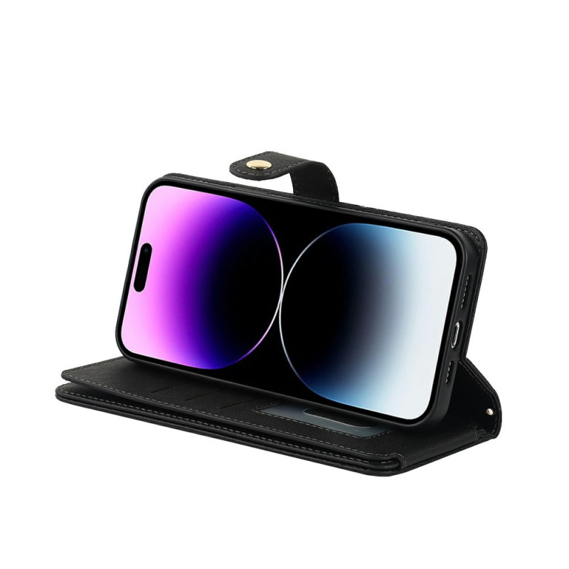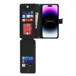 Étui portefeuille multifonction en cuir PU pour iPhone 14 Pro Max. Design tout-en-un avec multiples fentes pour cartes, poche zippée et compartiment pour espèces. Livré avec deux bandoulières détachables (poignet et épaule ajustable). Fonction support intégrée pour visionnage mains libres et fermeture magnétique sécurisée.
