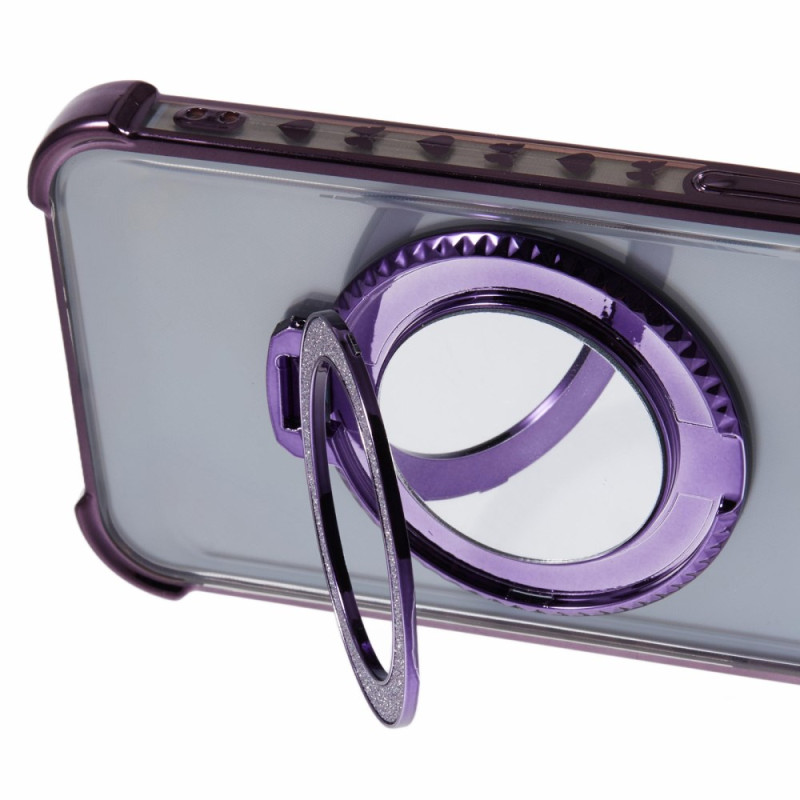 Elegante Hülle aus Premium-TPU für das iPhone 14 Pro Max mit seitlichem Herzmuster, integriertem Ringhalter und praktischem Spiegel. Verstärkter Schutz an allen vier Ecken gegen Stöße und Stürze, während das Design schlank und funktional bleibt.