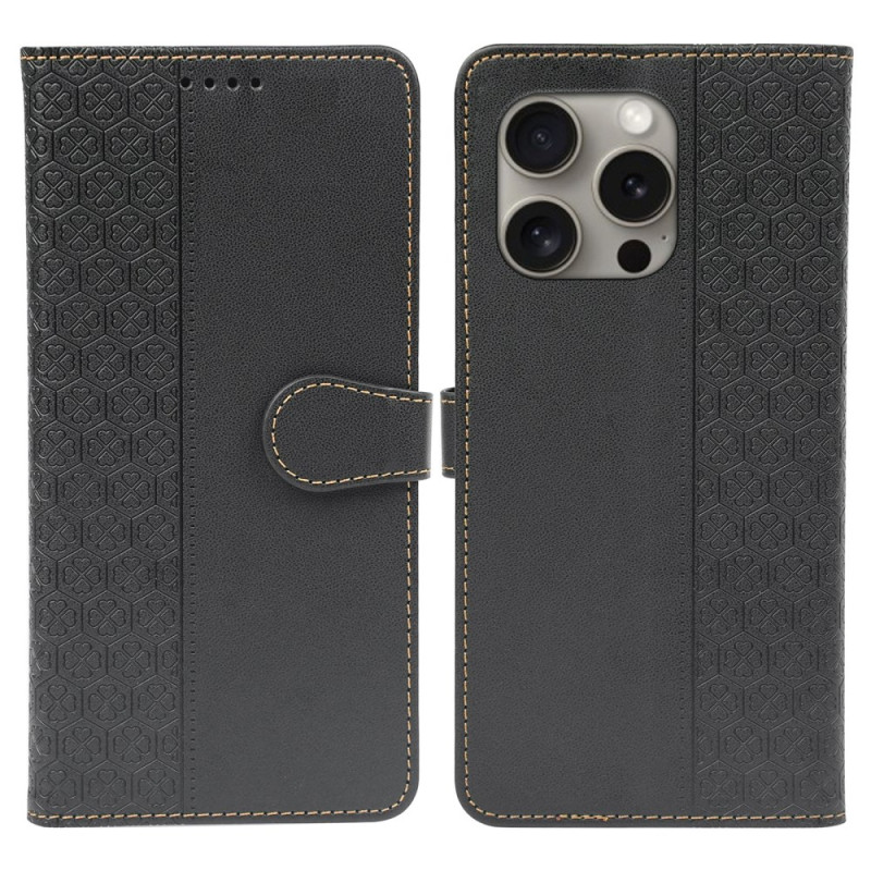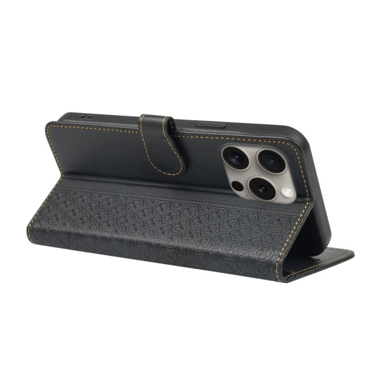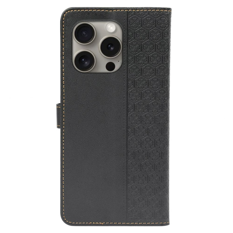 Entdecken Sie unsere elegante Lederhülle für das iPhone 14 Pro, die Stil und Funktionalität vereint. Mit ihrem Kleeblattmuster und dem praktischen Magnetverschluss bietet diese Hülle umfassenden Schutz und Platz für Ihre Karten. Nutzen Sie außerdem die Standfunktion für ein bequemes Betrachten.
