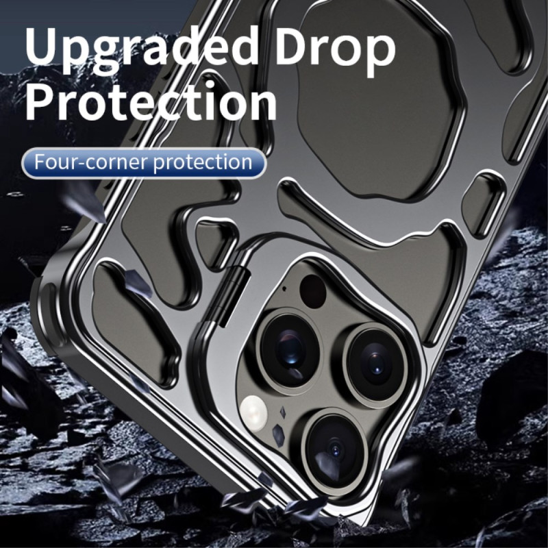 Entdecken Sie unsere magnetische Hülle aus einer Aluminiumlegierung aus der Luft- und Raumfahrt für das iPhone 14 Pro. Mit ihrem einzigartigen durchbrochenen Design bietet sie umfassenden Schutz, eine effektive Wärmeableitung und einen unsichtbaren integrierten Ständer. Die Hülle ist mit dem kabellosen MagSafe-Ladegerät kompatibel und vereint Funktionalität und Stil für ein optimales Nutzererlebnis.