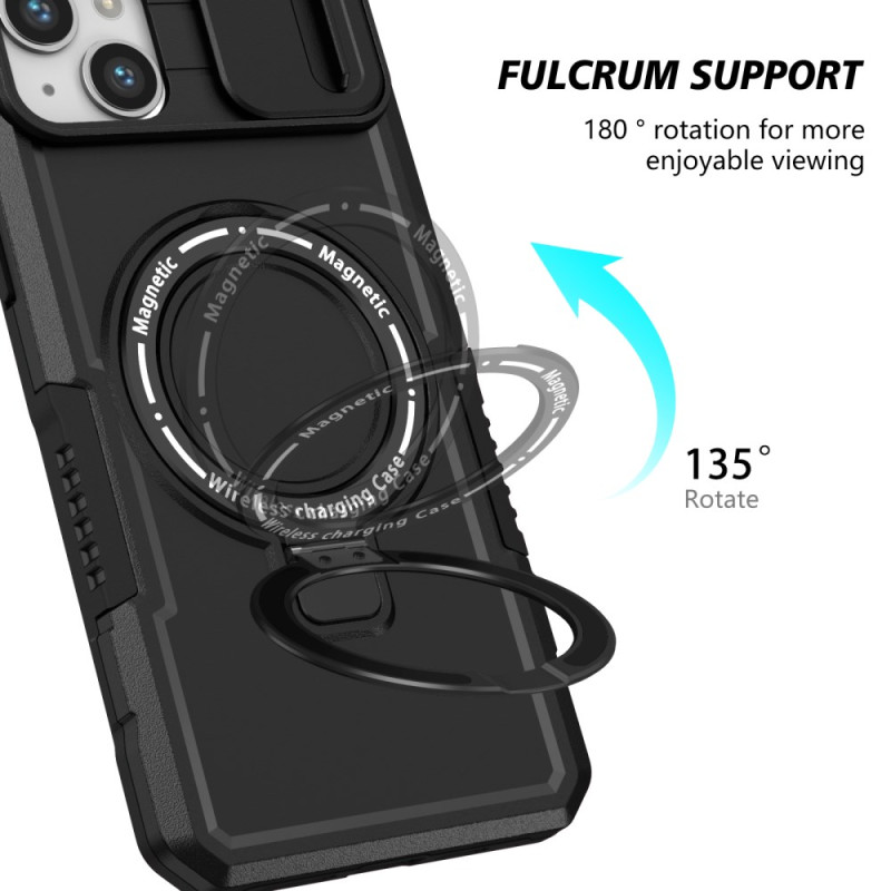 Entdecken Sie unsere innovative Schutzhülle für das iPhone 15 Plus. Mit einem praktischen Ständer, einem verschiebbaren Objektivschutz und MagSafe-kompatibel bietet sie militärischen Schutz vor Stößen und ermöglicht gleichzeitig das kabellose Aufladen. Ideal zum Anschauen von Videos und für eine einfache Handhabung.