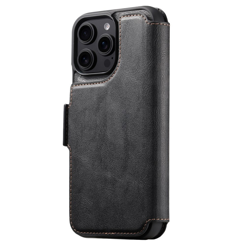 Entdecken Sie unsere elegante und funktionale Hülle für das iPhone 15 Pro Max. Sie verfügt über eine magnetische Absorption, die mit MagSafe kompatibel ist, und bietet dauerhaften Schutz aus strukturiertem PU-Leder und TPU. Das abnehmbare 2-in-1-Design kombiniert eine schlanke Hülle mit einer praktischen Brieftasche mit Fächern für Karten und Geldscheine.