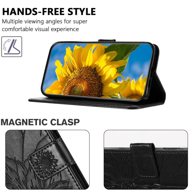Elegante Brieftasche aus PU-Leder mit geprägtem Sonnenblumenmotiv für das iPhone 17E / 16E. Klappendesign mit Ständerfunktion, Kartenschlitzen und sicherem Magnetverschluss. Rundumschutz gegen alltägliche Stöße und Stürze.