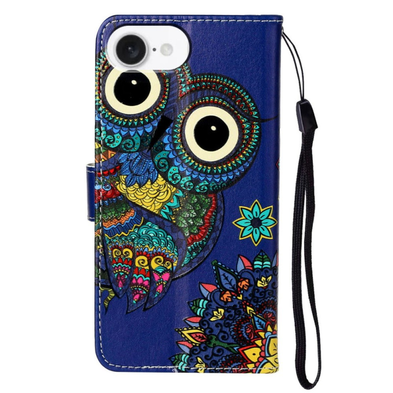 Elegante Brieftasche mit blauem Eulenmotiv für das iPhone 17E / 16E. Praktisches Design mit Kartenhalter, verstellbarer Halterung und Handschlaufe. Vollständiger Schutz vor Stößen und Kratzern. Perfekt, um Karten und Geld sicher zu transportieren.