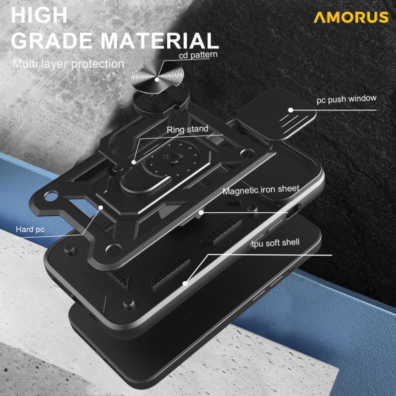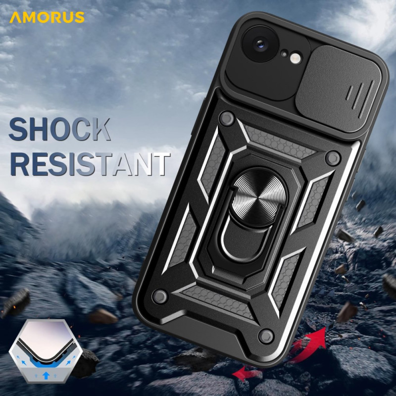Schützen Sie Ihr iPhone 17E / 16E stilvoll mit dieser Premium-Hülle von AMORUS, die über einen drehbaren Ständer, einen verschiebbaren Kameraschutz und eine Stoßfestigkeit auf Militärniveau verfügt. Kompatibel mit magnetischen Autohalterungen.