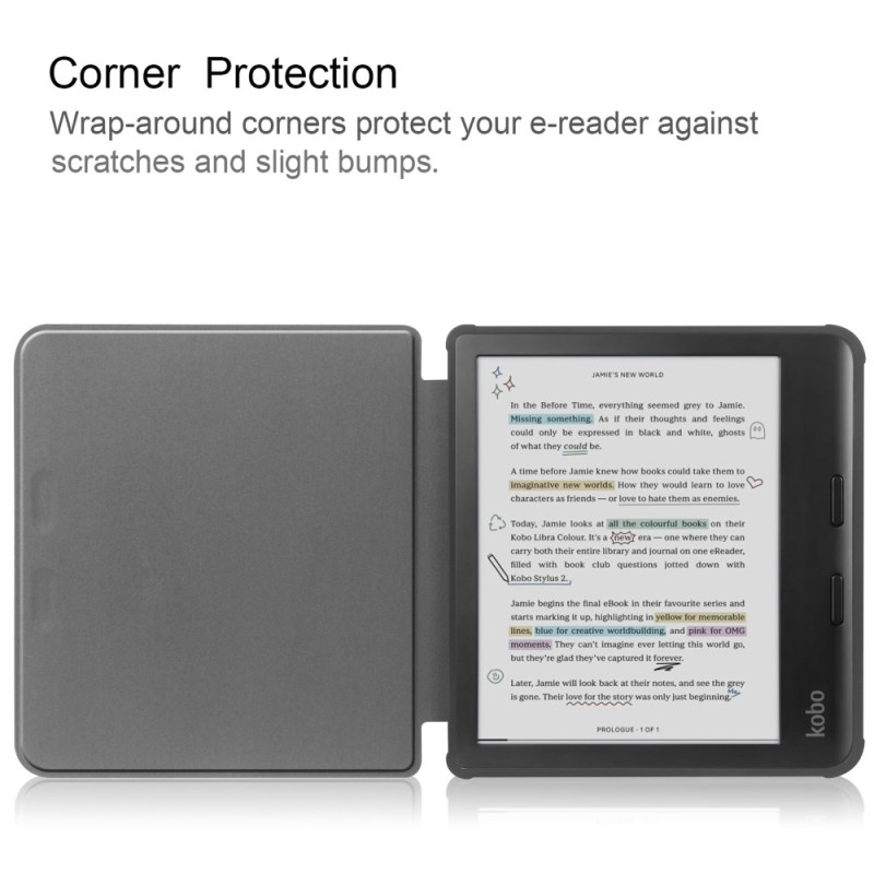 • Les coins enveloppants protègent votre e-reader contre les rayures et les légers chocs