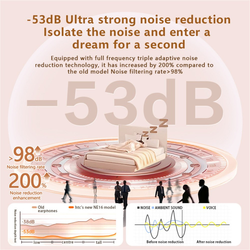 Die HTC TWS Bluetooth 6.0 Kopfhörer bieten eine offene Hörweise, bei der du deine Umgebung aufmerksam wahrnehmen kannst, während du einen lang anhaltenden Tragekomfort genießt. Der AURA Voice-Algorithmus verstärkt die mittleren und hohen Frequenzen, um Stimmen hervorzuheben und eine klare und präzise Klangatmosphäre zu bieten. Das hochempfindliche Mikrofon in Verbindung mit ENC reduziert effektiv Windgeräusche für reibungslose Anrufe. Die Akkulaufzeit von ca. 4,5 Stunden und das schnelle Aufladen sorgen für einen kontinuierlichen Betrieb, während die berührungsempfindlichen Bedienelemente den Zugriff auf den Musik- und Spielmodus erleichtern.