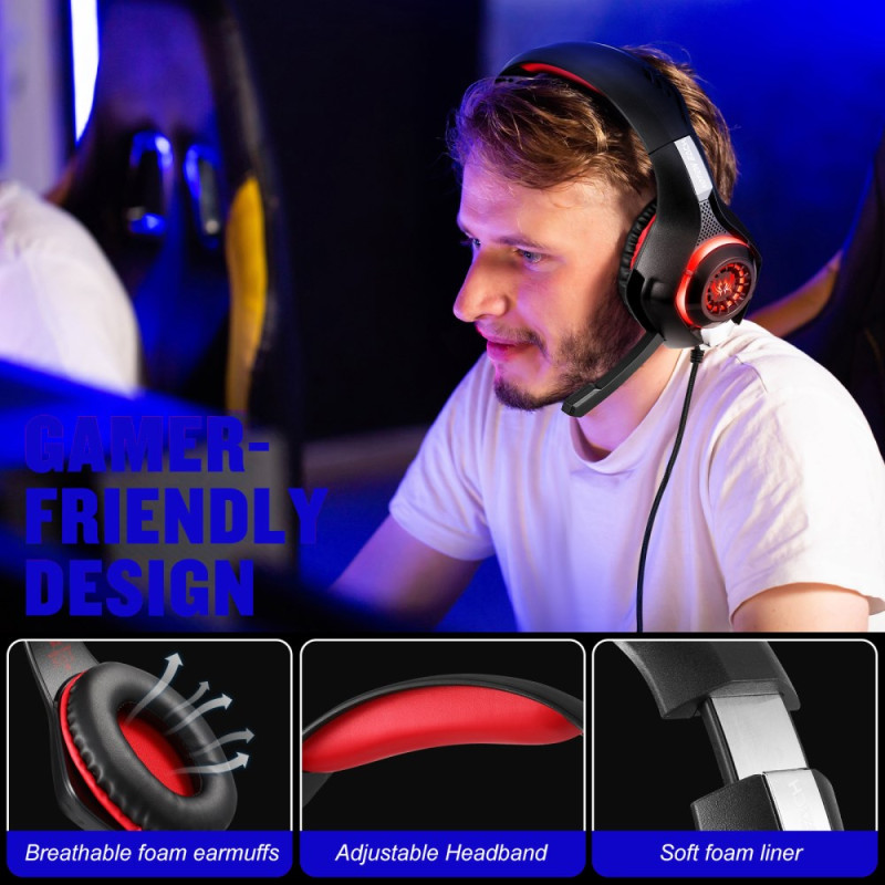 Das GS400 Headset von KOTION EACH ist mit PC, PS4 und PS5 kompatibel und bietet ein immersives Spielerlebnis auf mehreren Plattformen. Seine 40-mm-Lautsprecher liefern einen klaren und kräftigen Klang, der die Erkennung von Geräuschen im Spiel erleichtert. Die LED-Beleuchtung verstärkt die Gaming-Atmosphäre mit einem attraktiven visuellen Effekt. Das ohrumschließende Design aus Proteinleder sorgt für lang anhaltenden Tragekomfort auch bei langen Sessions. Das integrierte Mikrofon ermöglicht eine klare Kommunikation, während das 1,9 m lange, geflochtene Kabel für Robustheit und Strapazierfähigkeit sorgt.