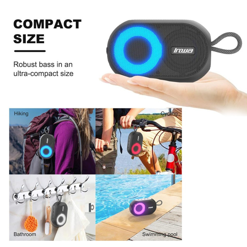 Dieser wasserdichte Lautsprecher von INWA bietet ein kompaktes Format und eine erstaunliche Klangleistung dank seines 8-W-Lautsprechers und des Bassverstärkers. Er ist nach IP67 zertifiziert und hat eine Akkulaufzeit von bis zu 12 Stunden. Bluetooth 5.1 sorgt für eine schnelle und stabile Verbindung und mit der TWS-Funktion kannst du zwei Lautsprecher zu einer Stereo-Bühne verbinden. Außerdem verfügt er über ein Mikrofon für freihändiges Telefonieren, einen Typ-C-Anschluss für schnelles Aufladen und einen TF-Steckplatz für noch mehr Einsatzmöglichkeiten. Die farbigen LEDs sorgen für eine moderne und dynamische Optik.