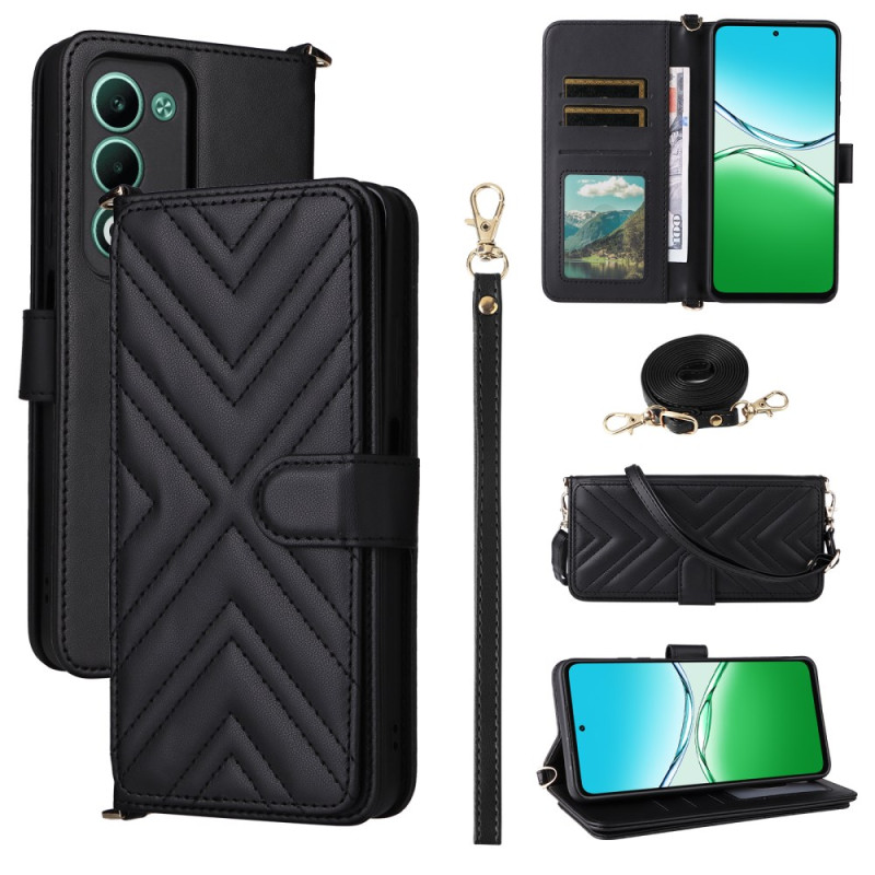 Multifunktionale Tasche aus Premium-PU-Leder für Oppo A5 5G / 4G. Wallet-Design mit 6 Kartenfächern, verstellbarer Halterung und sicherem Magnetverschluss. Wird mit verstellbarem Schultergurt und abnehmbarer Handschlaufe für vielseitigen Transport geliefert.