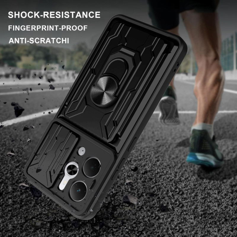Entdecken Sie unsere innovative Hülle für Realme 14 5G. Sie ist aus hochwertigem TPU und PC gefertigt und bietet mit ihrer integrierten Halterung, dem Kartenhalter und dem Schieber für die Kamera optimalen Schutz.
